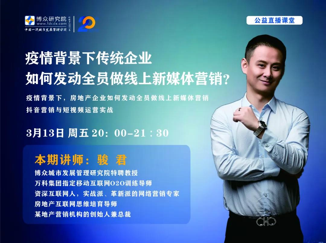 3月8日,博众研究院·云学院再次推出《房地产企业管理》公益课程,博众研究院特聘教授、原金地集团总部营销总兼品牌运营负责人刘海波老师讲授,直播观看人次达7569。