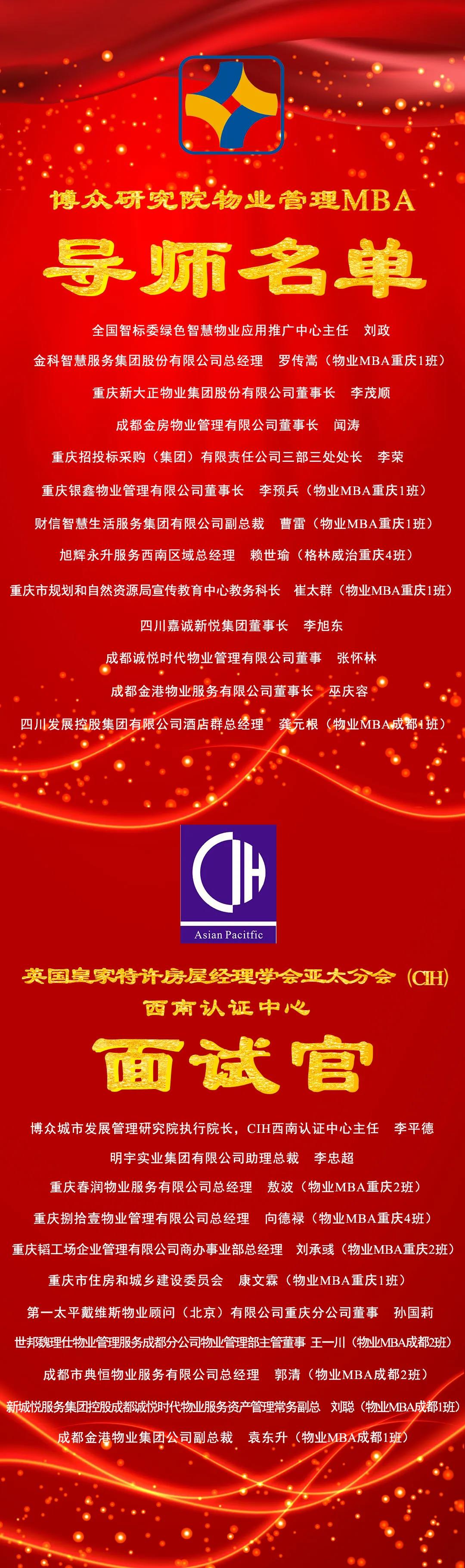 2020年7月25日,博众研究院联合重庆理工大学MBA教育中心推出的国内首个物业管理MBA课程班(成渝8期)隆重开学。重庆理工大学副校长廖林清,重庆市住建委二级巡视员彭安绪,物业监督管理处副处长何建,重庆市物业管理协会会长、金科智慧服务集团股份有限公司总经理罗传嵩,重庆市物业管理协会秘书长何伟,重庆新大正物业集团股份有限公司董事长李茂顺,成都金牛区物业协会会长、成都金港物业服务有限公司董事长巫庆等成渝两地物业管理行业嘉宾及物业管理MBA课程班成渝8期、重庆MBA6~7期共120余人参加开学典礼。博众研究院执行院长李平德主持本次典礼。