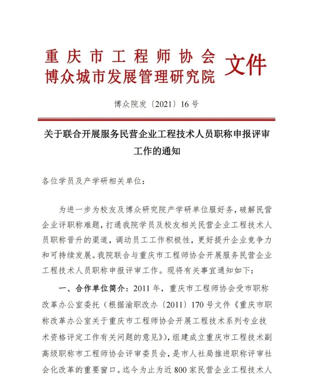 为进一步为校友及博众研究院产学研单位服好务,破解民营企业评职称难题,打通我院学员及校友相关民营企业工程技术人员职称晋升的渠道,调动员工工作积极性,更好提升企业竞争力和可持续发展。我院联合与重庆市工程师协会开展服务民营企业工程技术人员职称申报评审工作。