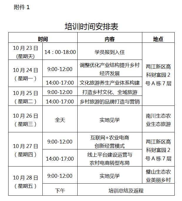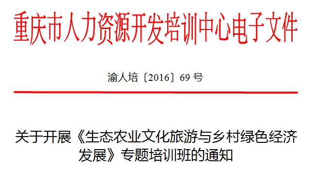 近日,重庆市人民政府发布了《关于加快乡村旅游发展的意见》(以下简称《意见》),提出推进乡村观光旅游向乡村休闲度假和乡村生活体验转型升级,到2020 年重庆将创建10 个全国休闲农业与乡村旅游示范县,打造十大乡村旅游产业集群,建成100 个特色旅游镇,1000 个特色旅游村的目标。根据《意见》的相关精神和目标要求,为了帮助各基层干部队伍丰富知识结构、提升相关技能素质,打造一支有文化、懂技术、会经营、善管理的专业人才队伍,共建美好的宜居生活环境,共促我市生态农业文化旅游与绿色经济发展。经研究,市人力资源开发培训中心和重庆博众房地产管理研究院决定于2016年下半年联合举办《生态农业文化旅游与乡村绿色经济发展》专题培训班,培训采用系统化的教学模式进行。现将有关事宜通知如下: