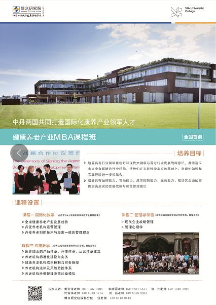 与此同时,博众研究院携手重庆市养老服务协会联合丹麦VIA大学推出的健康养老MBA课程班重庆1班即将开学,打造专业康养产业管理人才。
