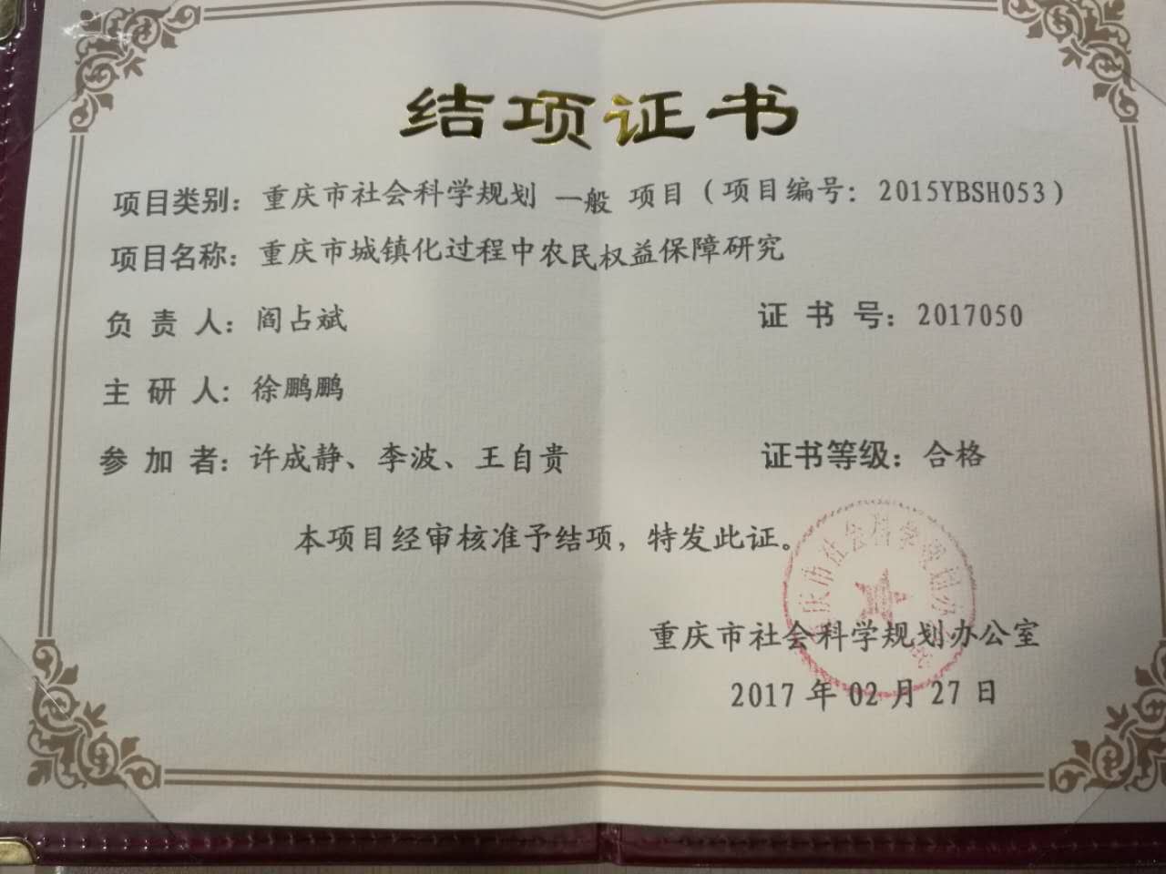 该课题取得评审专家的一致好评并获得重庆市社会科学规划办公室颁发的结项证书。