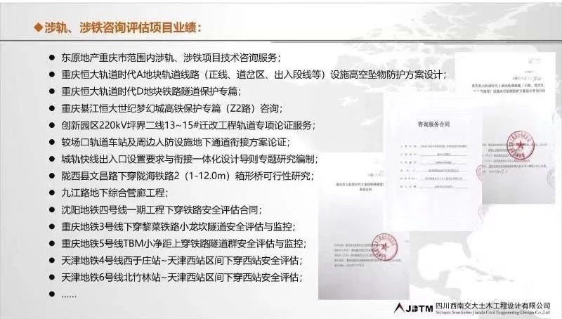 涉涉轨项目咨询评估方面专业技术渠道优势显著。公司依托西南交通大学在铁路工程及城市轨道交通工程领域的雄厚科研技术实力,在重庆地区完成涉轨涉铁各类设计咨询合同20余项,先后为东原地产、恒大地产、富州地产、中迪地产、富力地产、两江集团悦来公司、凯源燃气等房地产开发企业及建设单位提供涉轨涉铁项目设计咨询评估等服务。服务过程中想业主之所想,急业主之所及,凭借过硬的技术实力及良好的项目管理及服务,取得委托方的一致好评。