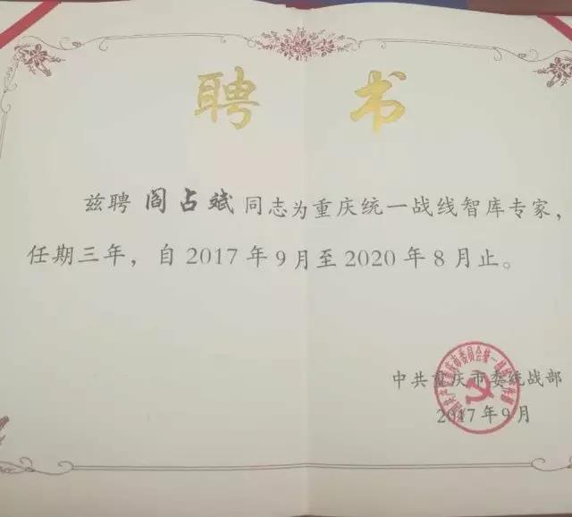 会上,142位各领域人士受聘为重庆统一战线智库专家;智库有政治与法律、经济、工程与技术、生态环境、文化与科教、医疗卫生、公共管理与社会服务、统战理论八大专业组。阎占斌受聘为工程与技术组专家,为党委、政府重大决策提供咨询论证意见。
