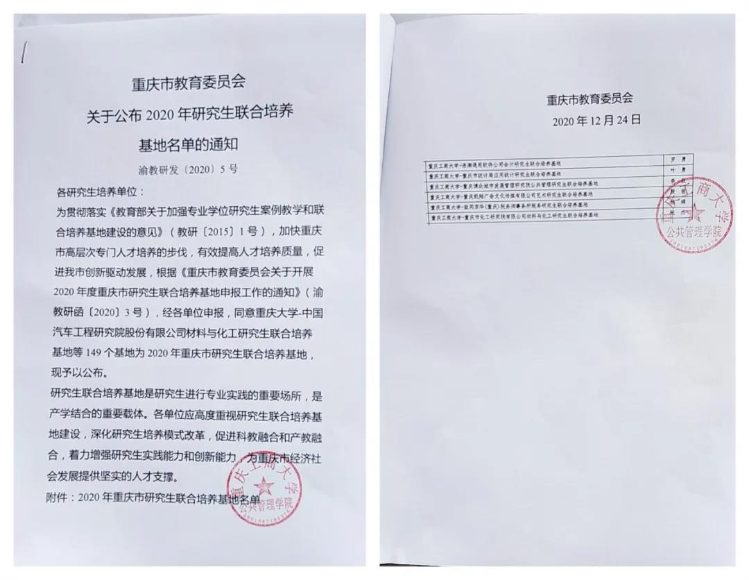 近日,重庆市教育委员会发布通知,为贯彻落实《教育部关于加强专业学位研究生案例教学和联合培养基地建设的意见》,加快重庆市高层次专门人オ培养的步伐,有效提高人才培养质量,促进我市创新驱动发展,根据《重庆市教育委员会关于开展2020年度重庆市研究生联合培养基地申报工作的通知》,同意重庆工商大学-博众城市发展管理研究院联合培养公共管理研究生基地成为2020年重庆市研究生联合培养基地。