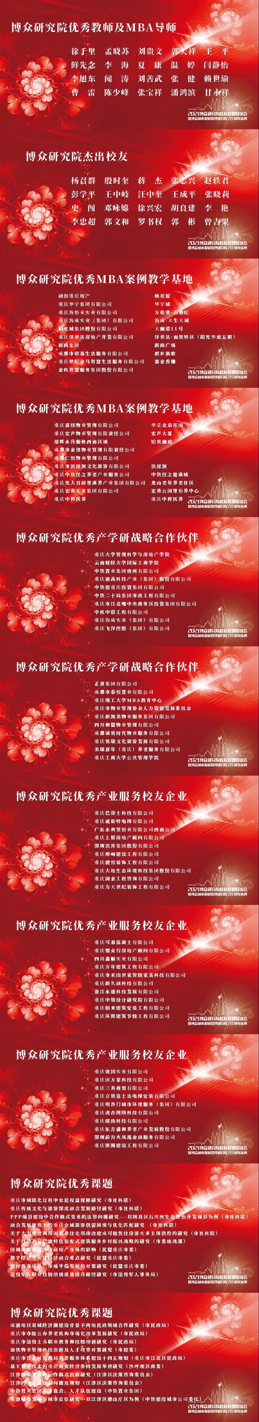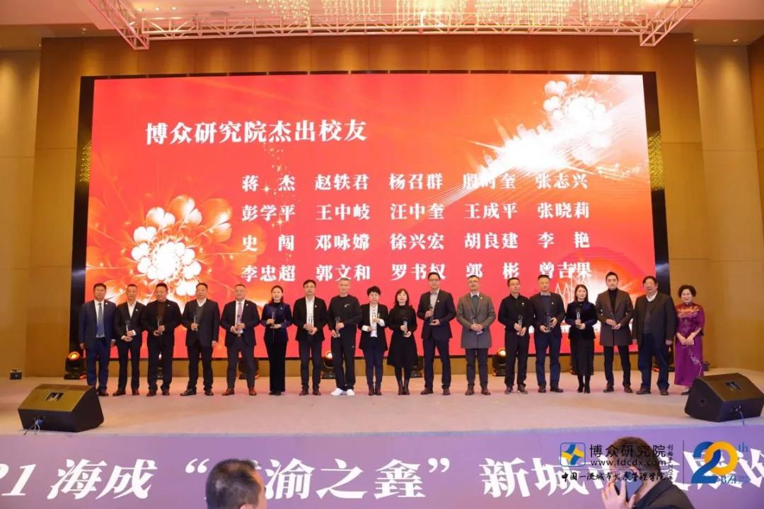 在20周年庆典博众研究评选并表彰了蒋杰、彭学平等20名优秀杰出校友,徐千里、孟晓苏等20名优秀教授,融创地产、洪崖洞等20个优秀案例教学基地,《关于打造具有巴渝特色装配式建筑服务乡村振兴战略的研究》、《中铁置业集团人才盘点、人才队伍建设》等20个优秀课题,重庆大学管理科学与房地产学院、中铁20局市政公司等20个产学研战略合作伙伴。