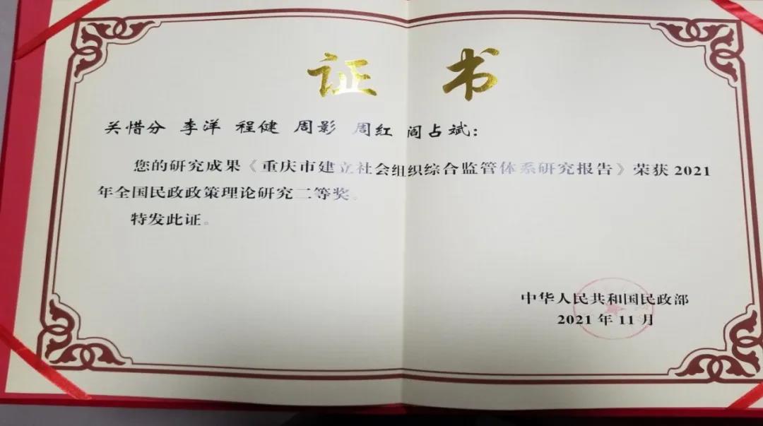 为深化民政政策理论研究,推进新时代民政事业高质量发展。近日,民政部对全国民政系统及高校科研机构提交的各类论文组织专家进行了评审,由我院参与的《重庆市建立社会组织综合监管体系研究》获得民政部2021年民政政策理论研究二等奖。